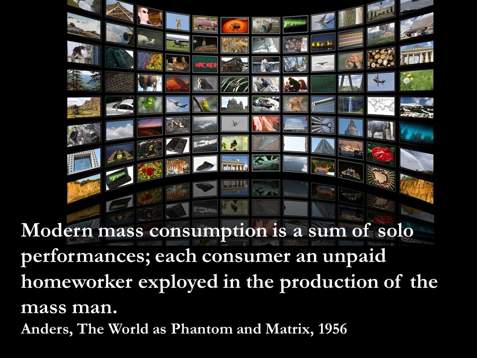 But for all the ubiquity of the media at the time, as overwhelming as it was for writers like Anders who wrote on radio ‘ghosts’ in 1930 and George Orwell, publishing his famous novel 1984 in 1949, all of that was nothing compared to what television would become, and none of that holds a candle to the media revolution that is the internet, whereby one can spend every waking hour, without trying too hard, not merely in the presence of the media — television and radio had already accomplished that — but directly, actively engaged.